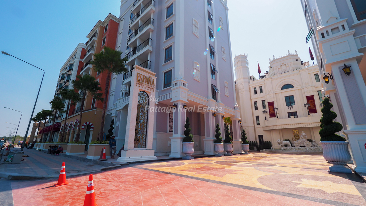 Espana Condo Resort Pattaya was the 4th successfully completed project here in Pattaya by Blue Sky Group Co.,Ltd., and was completed in Qtr 1, 2019. The project is situated on a prime 12 Rai – 2 Ngan – 25 Sq.Wah / 20,100 Square Meter plot of land alongside Jomtien 2nd Road in Jomtien, Pattaya, and is comprised of 1,094 apartments,ranging in size from 24 Sq.M, Studio / 1 Bathroom apartments followed by larger 35 Sq.M, 1 Bedroom / 1 Bathroom apartments and even larger 70 to 73 Sq.M, 2 Bedroom / 2 Bathroom apartments. The residential component is distributed across 7 low-rise, 8 Story buildings, each named after major Spanish cities – Madrid (Building A), Barcelona (Building B), Valencia (Building C), Seville (Building D), Granada (Building E), Bilbao (Building F), and Malaga (Building G) – all or which are serviced by 2 high-speed passenger lifts. Every residential building features its own private lobby and reception area w/ secure controlled access and personal mailboxes. Madrid (Building A) and Barcelona (Building B) also feature commercial zones on the Ground Floor, w/ 11 and 13 commercial shop units respectively that offer direct street frontage – including an onsite seven-eleven convenience store, further enhancing resident convenience and adding a vibrant neighborhood-like atmosphere to the development. Architecturally, the project showcases Andalusian-style window balconies, Spanish terracotta pots, and classic balustrade parapets that lend an authentic Mediterranean character to the developments facades and communal zones.