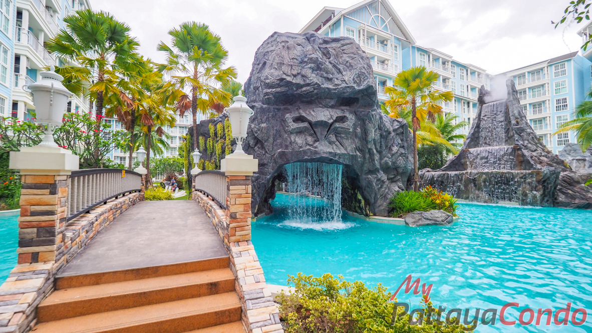 The project’s star attraction is its imaginative, family friendly, water park-themed pool zones. 2 Large communal swimming pools dominate the Ground Floor, complemented by a private footbridge w/ LED fairy lights that offers direct beach access to the semi-private beachfront. One pool features a wave pool w/ gently sloped beach-like edges, flanked by twin jacuzzi pavilions and a cascading faux rock waterfall. The second pool embraces a more playful, whimsical design w/ novelty fiberglass islands – one shaped like a giant gorilla’s head and volcano – both w/ cascading waterfalls, along w/ a volcano-themed waterslide and arched footbridges. These water park elements form the development’s primary focal point and are central to its identity as a fun-filled and immersive resort destination.