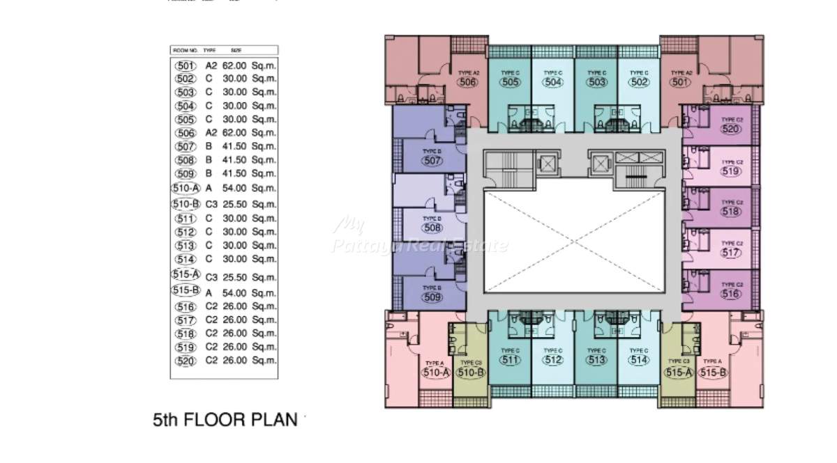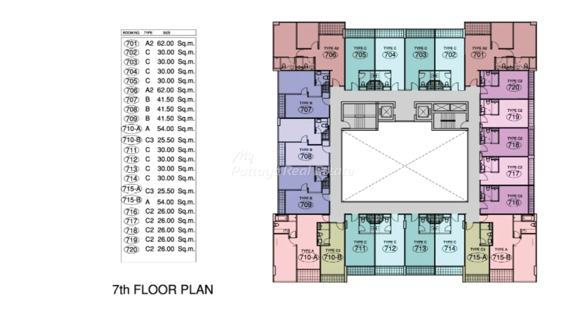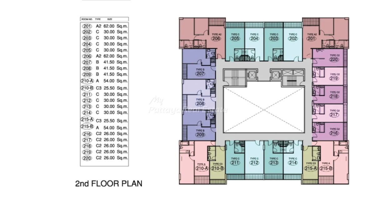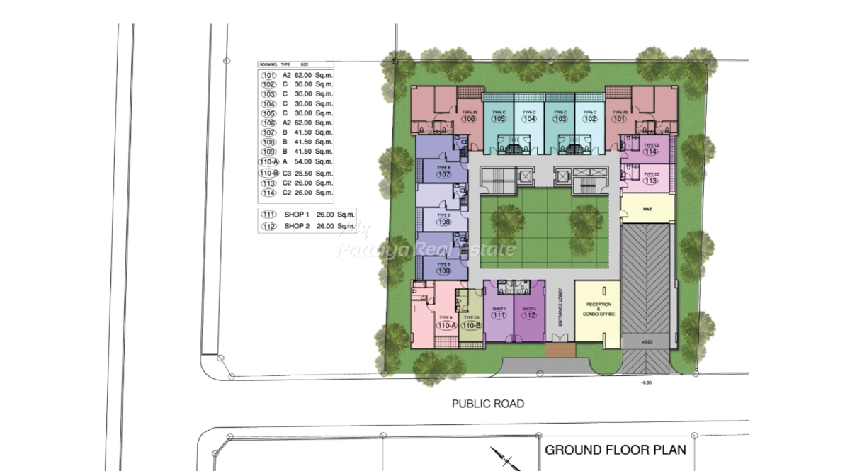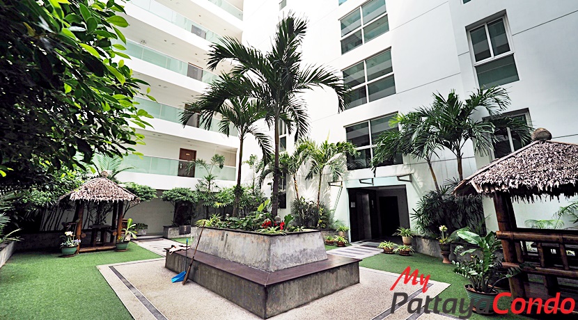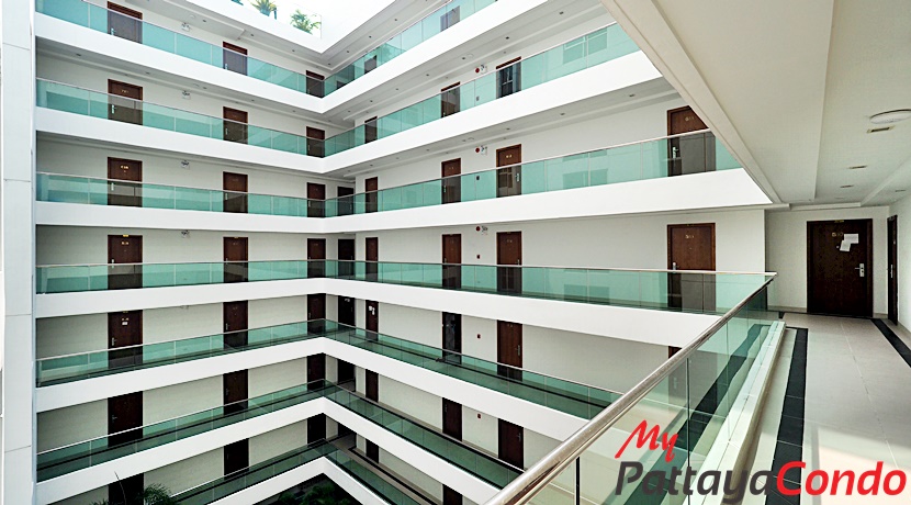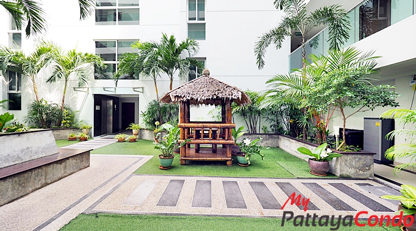 Laguna Bay 1 Pattaya is designed to offer both comfort and convenience. The Basement car park accommodates approximately 32 vehicles, ensuring ample parking space for residents and visitors. On the Ground Floor of Laguna Bay 1 Pattaya you will find the lobby, lounge, and reception area, all of which are secured by key-card access. There is also an onsite juristic management office to handle day-to-day administrative tasks and building maintenance. A standout feature of the project is its open-air courtyard garden on the Ground Floor, designed to maximize natural lighting, air circulation, and to create a peaceful atmosphere for relaxation. The garden is thoughtfully designed w/ a tree planter bench centerpiece and 2 bamboo and thatch seating huts, offering a serene space to unwind. The communal hallway corridors overlook this tranquil courtyard, ensuring bright, airy, and refreshing environment throughout the building.