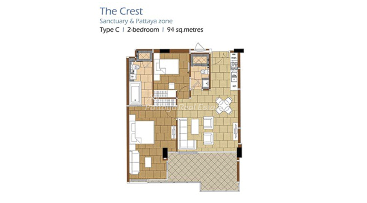 The Sanctuary WongAmat Pattaya – The Crest (B)- Type C, 94 Sq.M, 2 Bedroom / 2 Bathroom Unit Plan.