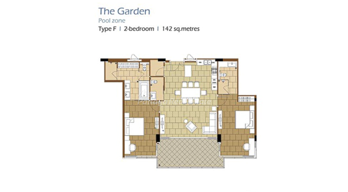 The Sanctuary WongAmat Pattaya – The Garden, Type F, 142 Sq.M, 2 Bedroom / 3 Bathroom Unit Plan.