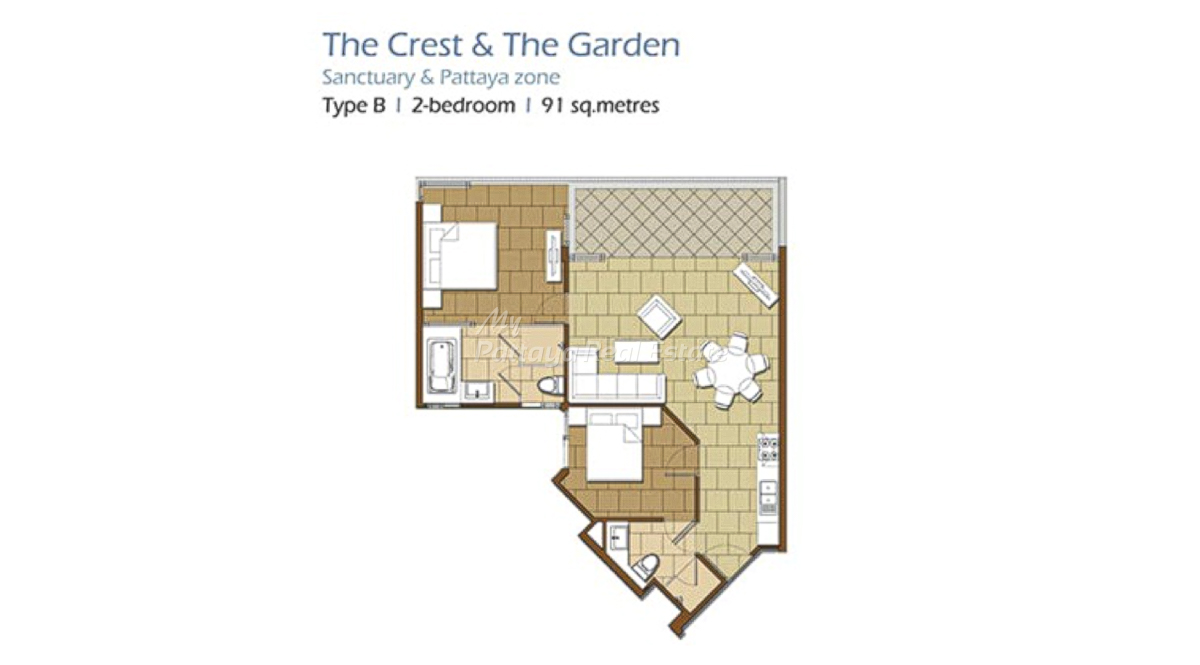 The Sanctuary WongAmat Pattaya – The Garden (A) & The Crest (B) – Type B, 91 Sq.M, 2 Bedroom / 2 Bathroom Unit Plan.
