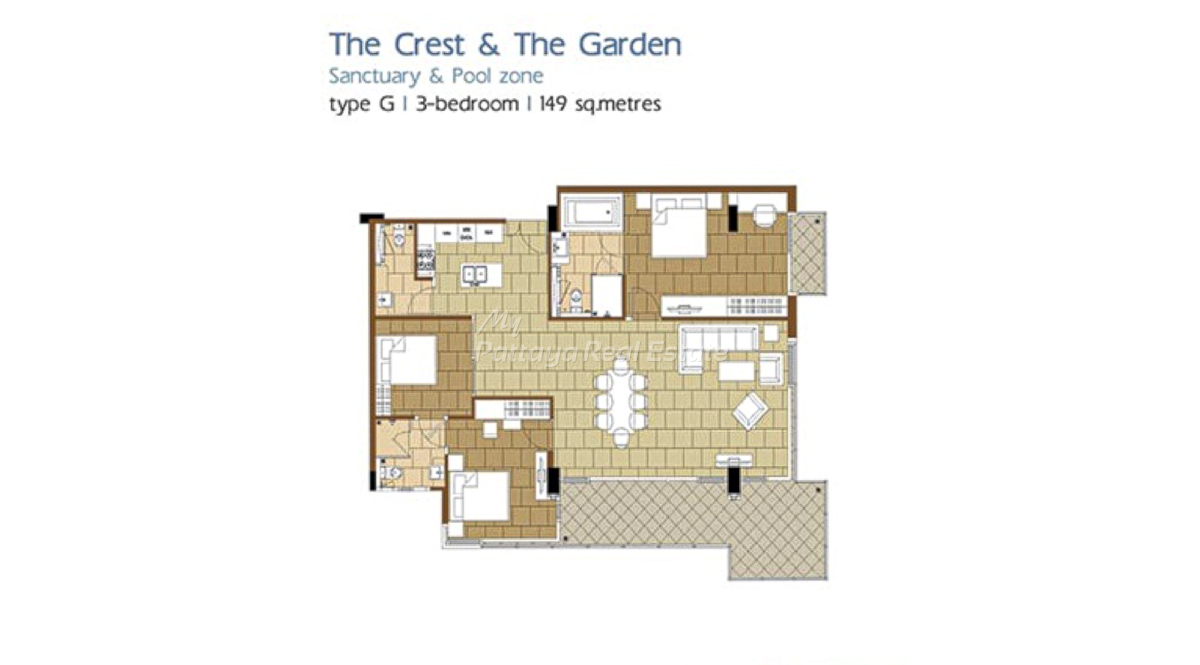 The Sanctuary WongAmat Pattaya – The Garden (A) & The Crest (B) – Type G, 149 Sq.M, 3 Bedroom / 3 Bathroom Unit Plan.