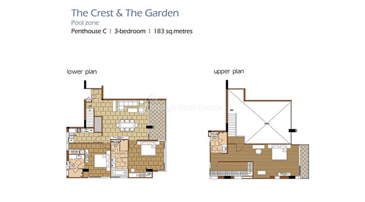 The Sanctuary WongAmat Pattaya – The Garden (A) & The Crest (B), Penthouse C, 183 Sq.M, 3 Bedroom / 3 Bathroom Penthouse Unit Plan.