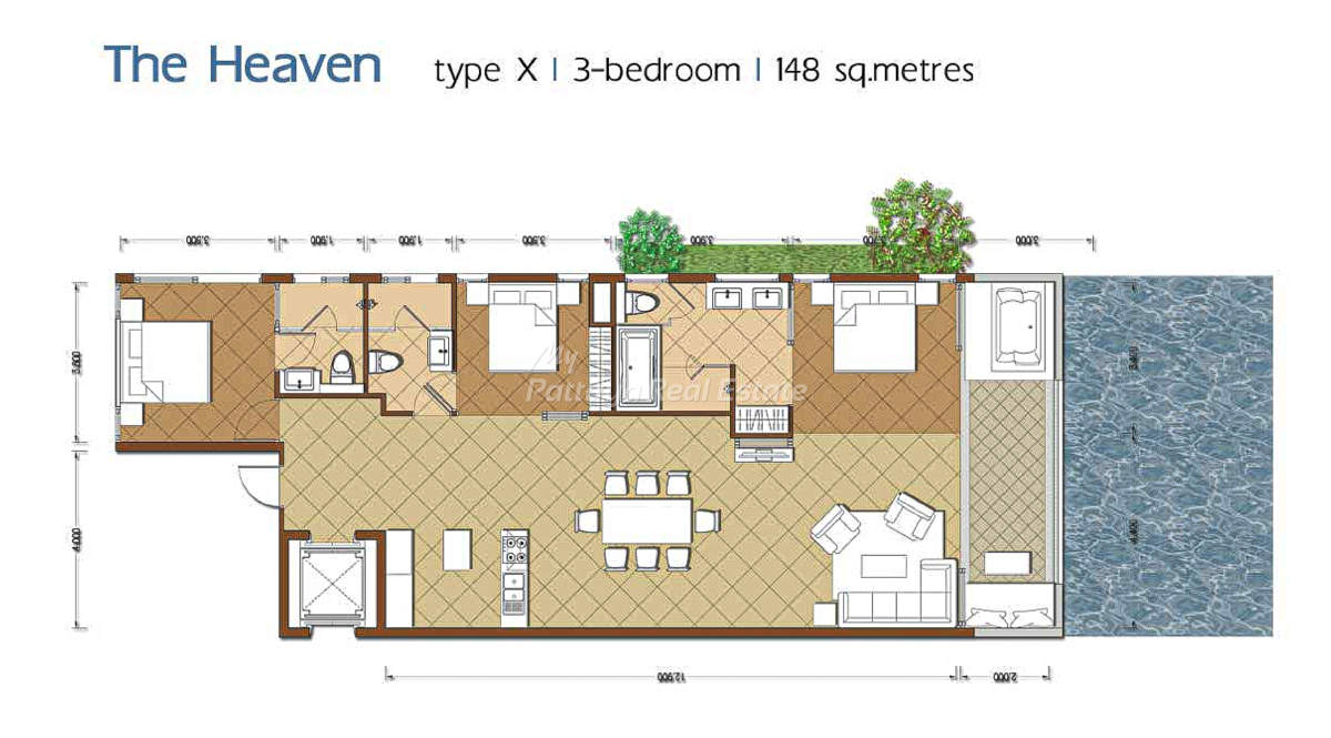 The Sanctuary WongAmat Pattaya – The Heaven (E), Type X, 148 Sq.M, 3 Bedroom / 3 Bathroom Unit Plan.