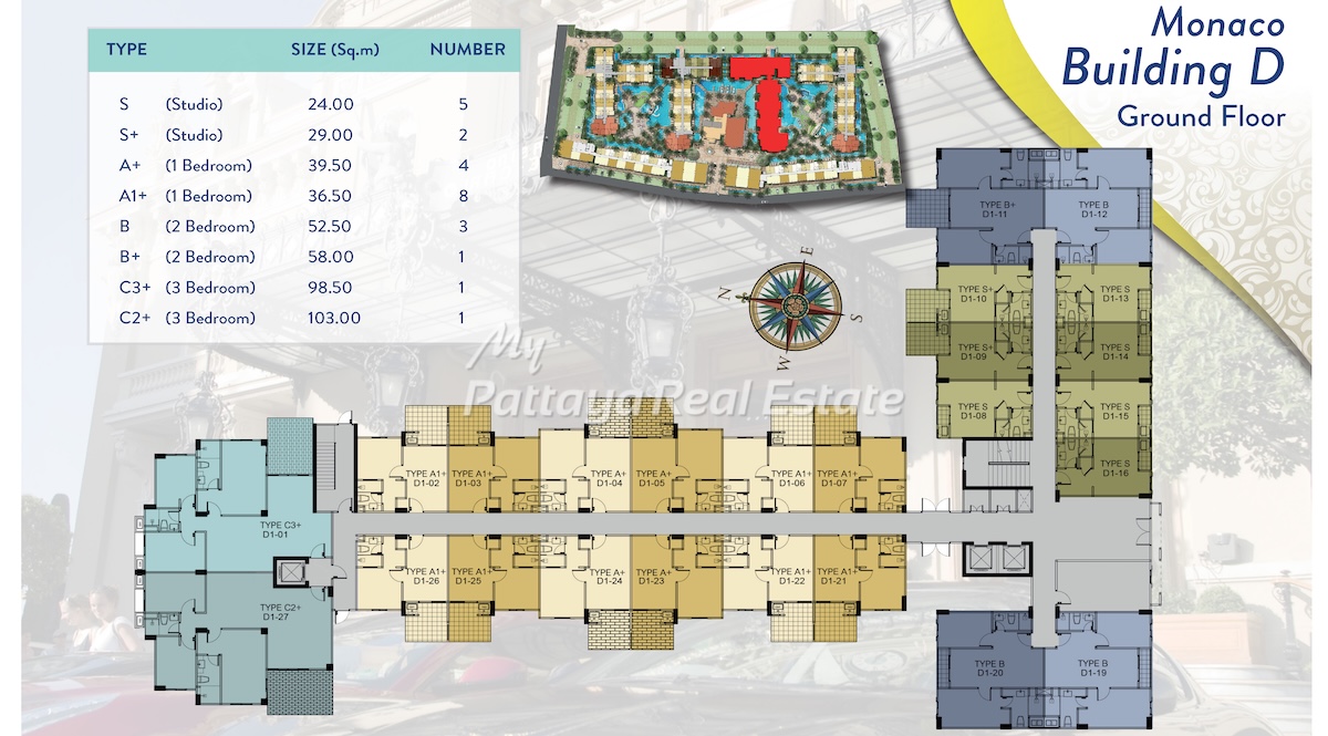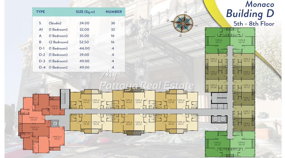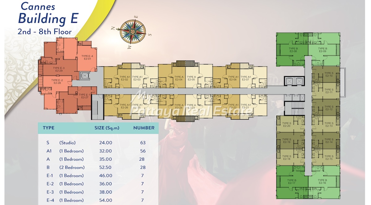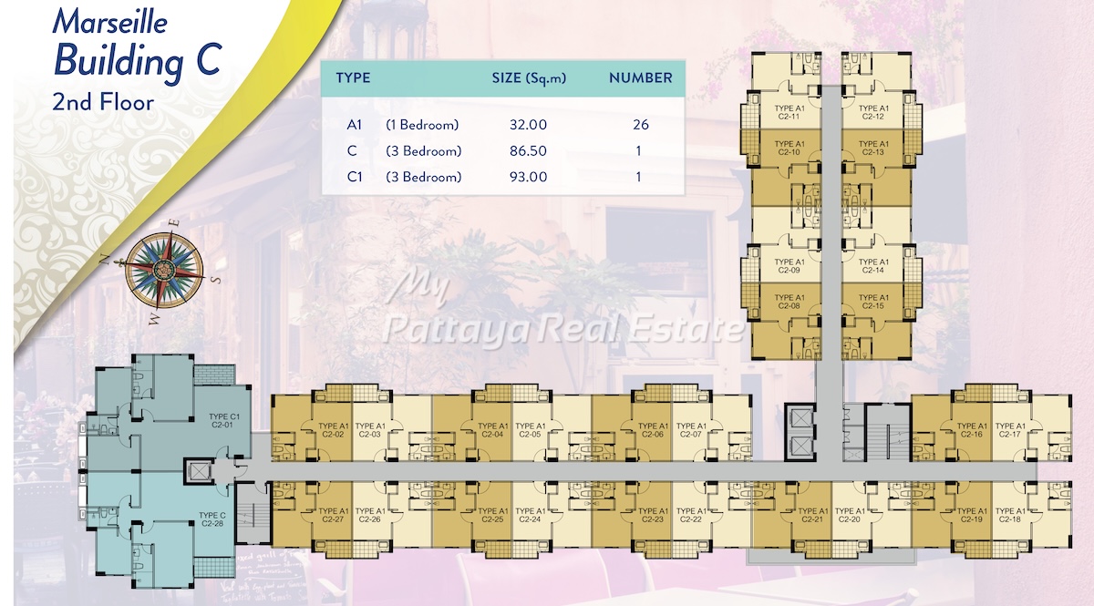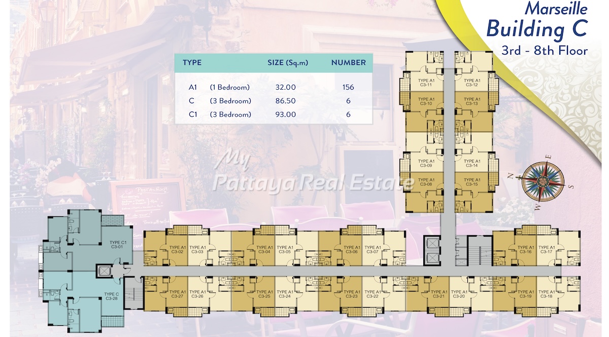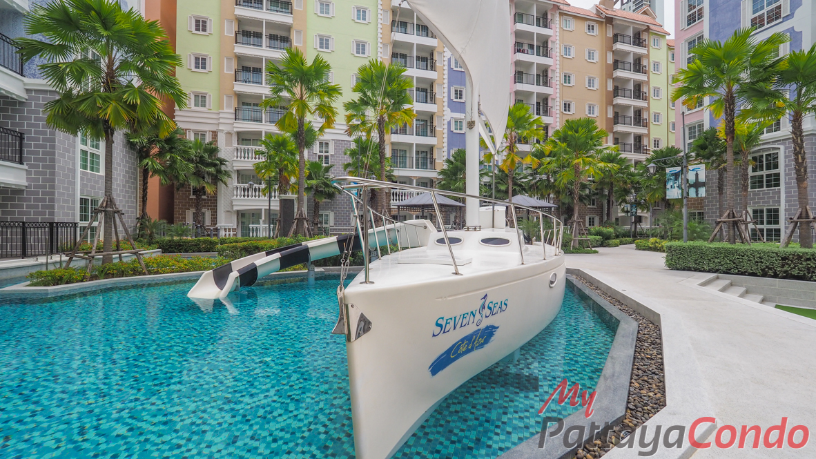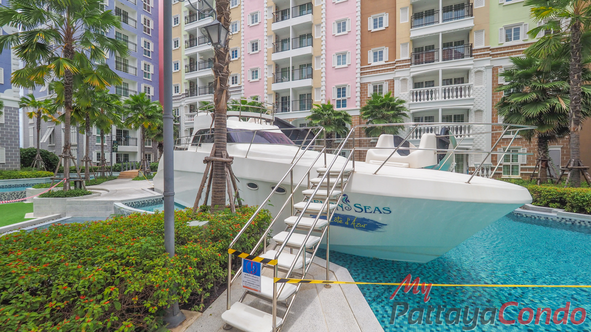 Seven Seas Côte ď Azur Condominium was the 2nd successfully project completed project under the “Seven Seas” brand by Universal Group (Thailand) Co.,Ltd., and was completed in Qtr 4, 2018. This fully themed French Riviera-inspired development is located on a prime 15 Rai – 2 Ngan – 11 Sq.Wah / 24,844 Square Meter plot of land alongside Soi 4 Na-Jomtien in Na-Jomtien. Whereas, the project itself is comprised of 1,308 apartments ranging in size from entry level 24 to 29 Sq.M, Studio / 1 Bathroom apartments followed by larger 35 to 36.50 Sq.M, 1 Bedroom / 1 Bathroom and even larger 58 to 73 Sq.M, 2 Bedroom / 2 Bathroom apartments before finally culminating in the ultimate creme-de-la-creme 86 to 103 Sq.M, 3 Bedroom / 2 Bathroom apartments spread across 6 low-rise, 8 Story buildings w/ 3 high-speed passenger lifts per building and a standalone clubhouse.