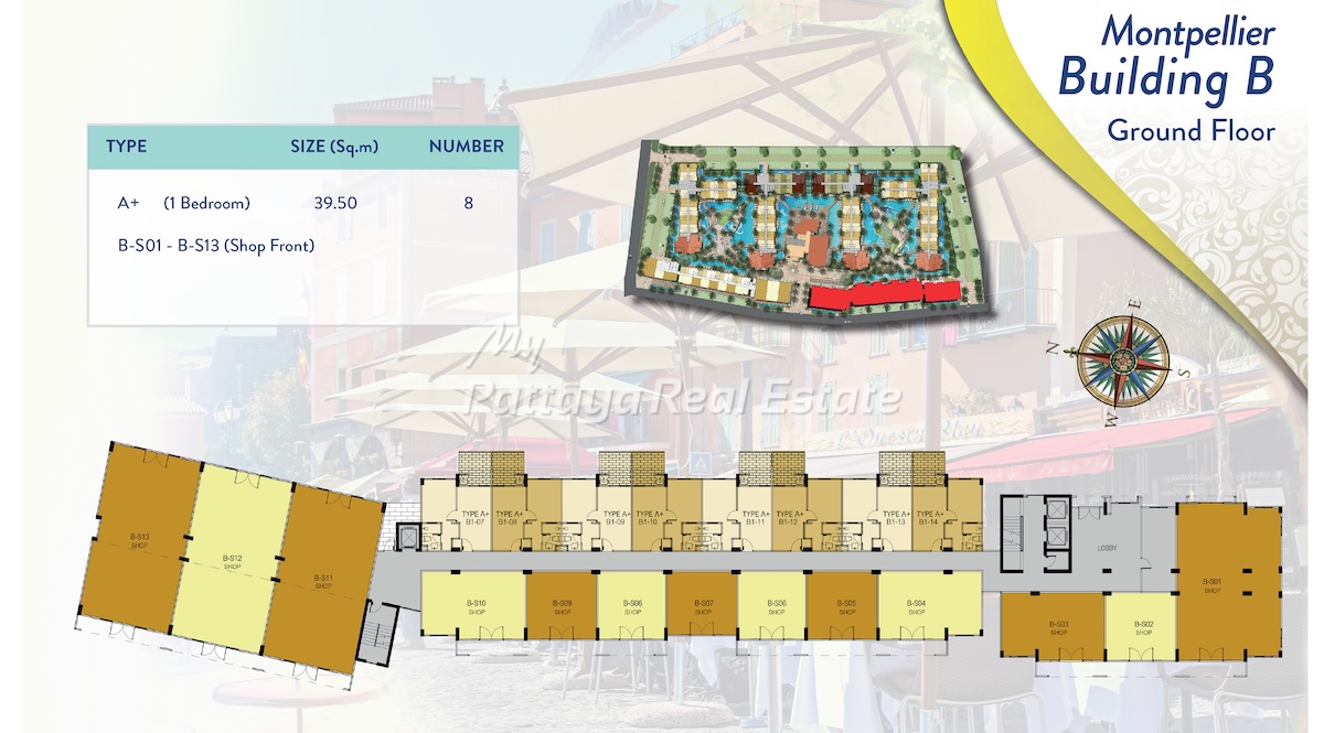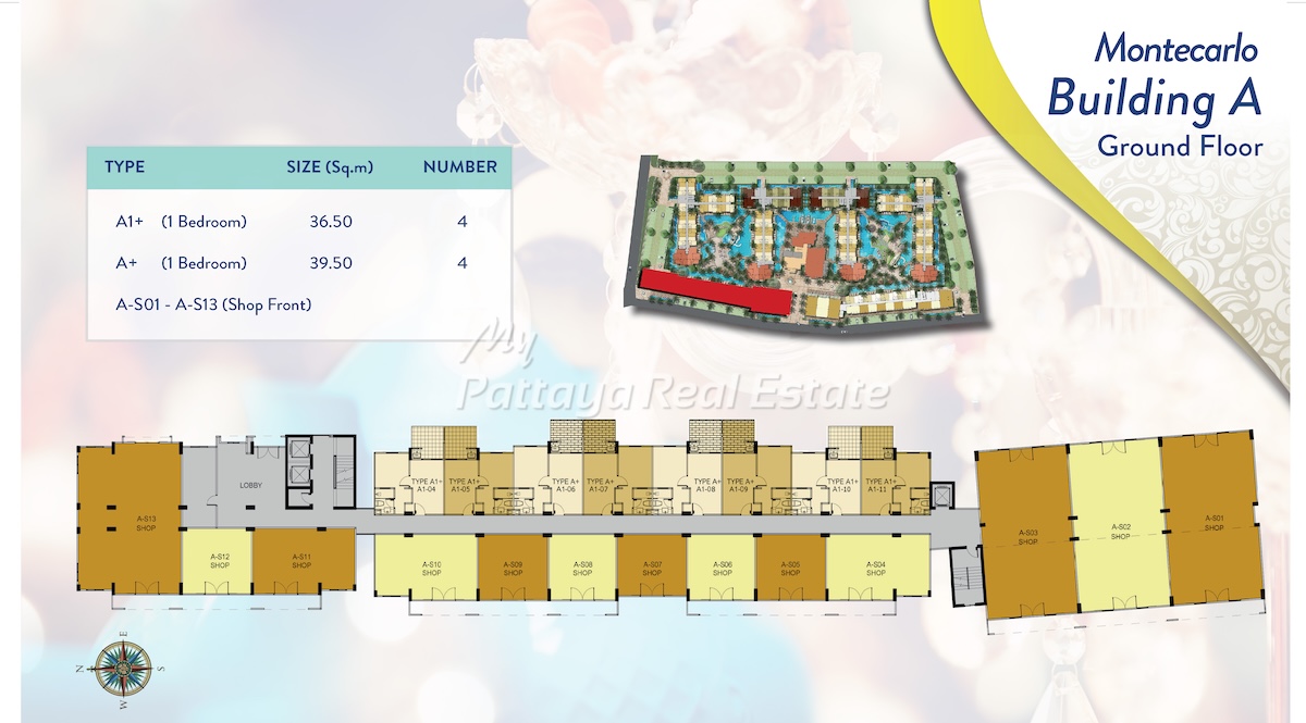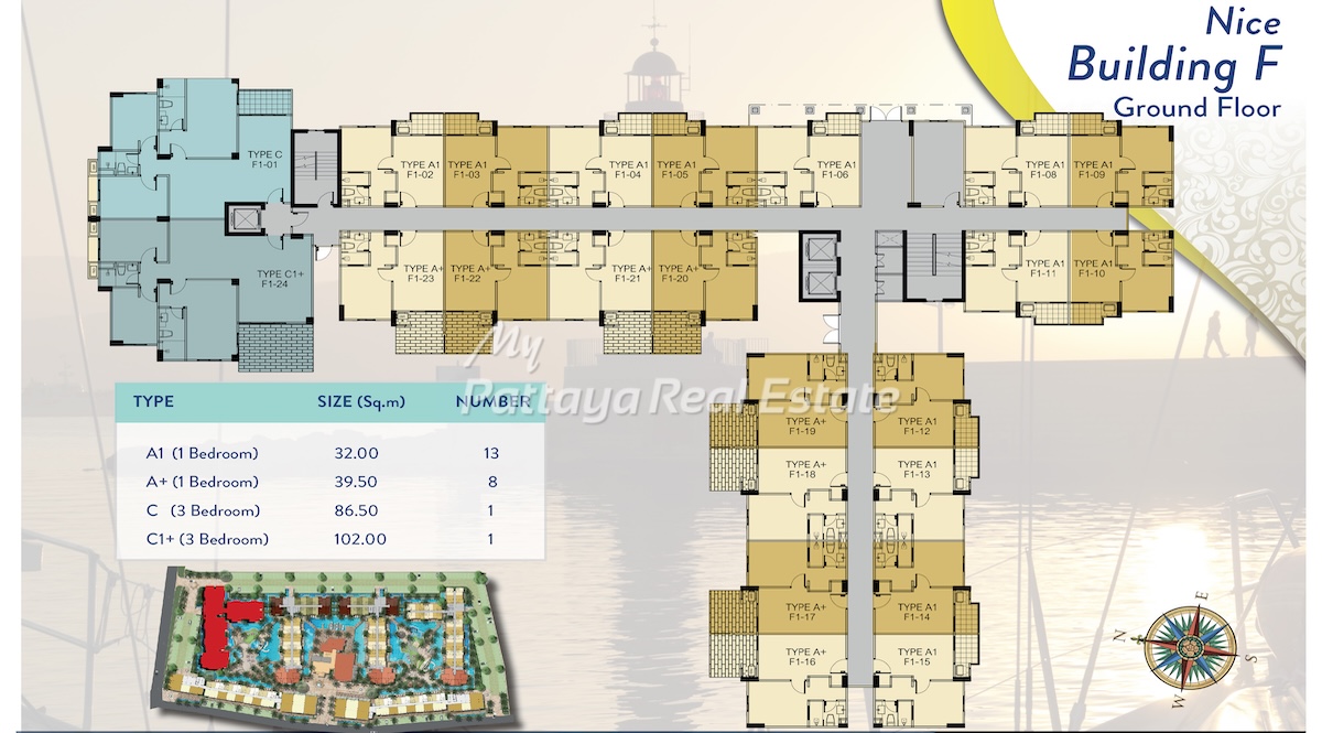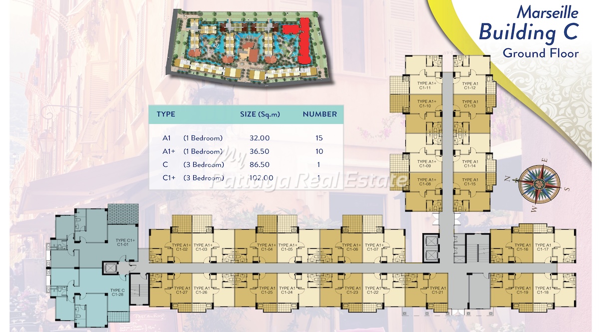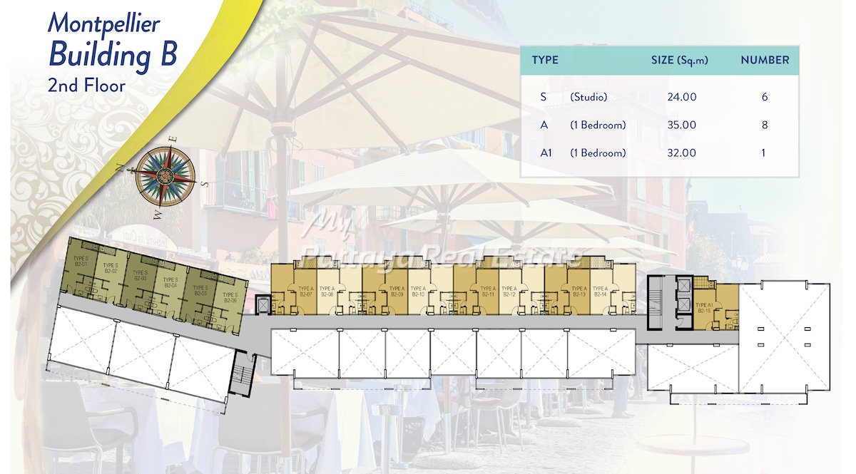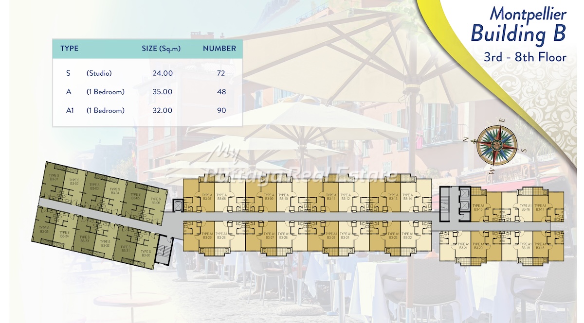 Drawing inspiration from the timeless beauty and elegance of Southern France, the developments architecture pays homage to the iconic Mediterranean cities. Each of the 6 residential buildings – Monte Carlo (Building A), Montpellier (Building B), Marseille (Building C), Monaco (Building D), Cannes (Building E), and Nice (Building F) – features classic European design elements harmonized w/ a tropical resort ambiance. Buildings A (Monte Carlo) and B (Montpellier) serve as the commercial and social anchors of the community. Both buildings offer Ground Floor secure, private lobbies w/ controlled access, personal mailboxes, Male & Female communal toilets, and 3 high-speed passenger lifts per building, one of which is reserved exclusively for residents of the larger-sized apartments. Both buildings also house a combined 26 commercial shop units, including an onsite seven-eleven convenience store for every day essentials, alongside boutique style outlets, motorbike rentals, coffee shops and other eateries. These shops line a vibrant, al-fresco, pier-side promenade complete w/ decorative boardwalks and landscaped water-features that echo the charm of a Mediterranean coastal town square. Buildings C (Marseille), D (Monaco), E (Cannes), and F (Nice) are similarly outfitted w/ private Ground Floor lobbies featuring controlled access and personal mailboxes, Male & Female communal toilets, and 3 high-speed passenger lifts per building – again, w/ 1 lift prioritized for VIP residents occupying the premium unit types. The projects ground level is a thoughtfully curated oasis of recreation and relaxation, catering to families, couples and retirees alike. Manned security booths and controlled vehicle and pedestrian access points ensure safety throughout. Turf-block paved parking zones are located around the projects outermost perimeter, providing Ground Floor communal first-come-first-serve outdoor parking for approximately 221 vehicles. Followed by a sequence of landscaped drop-off zones adorned w/ circular water-feature centerpieces leads residents and guests towards the relevant residential buildings, and/or central retail promenade and clubhouse.