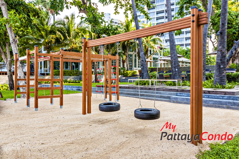 At the Ground Floor, Zire WongAmat Pattaya opens into a vibrant communal zone highlighted by a large beachfront swimming pool and sundeck, sun-loungers, and umbrellas. This leisure space is complemented by a shallow children’s pool w/ a decorative waterspout feature, and a dedicated outdoor playground and beach terrace designed for families. Surrounding the pool, lush tropical landscaped gardens provide natural beauty and shade, while a manned private gate grants residents direct access to Wong Amat Beach. For added convenience Male & Female restrooms are located at this level, and the beachfront lifestyle is further enhanced by the onsite The Glass House Silver Restaurant, a stylish and upmarket dining venue directly integrated within the project.