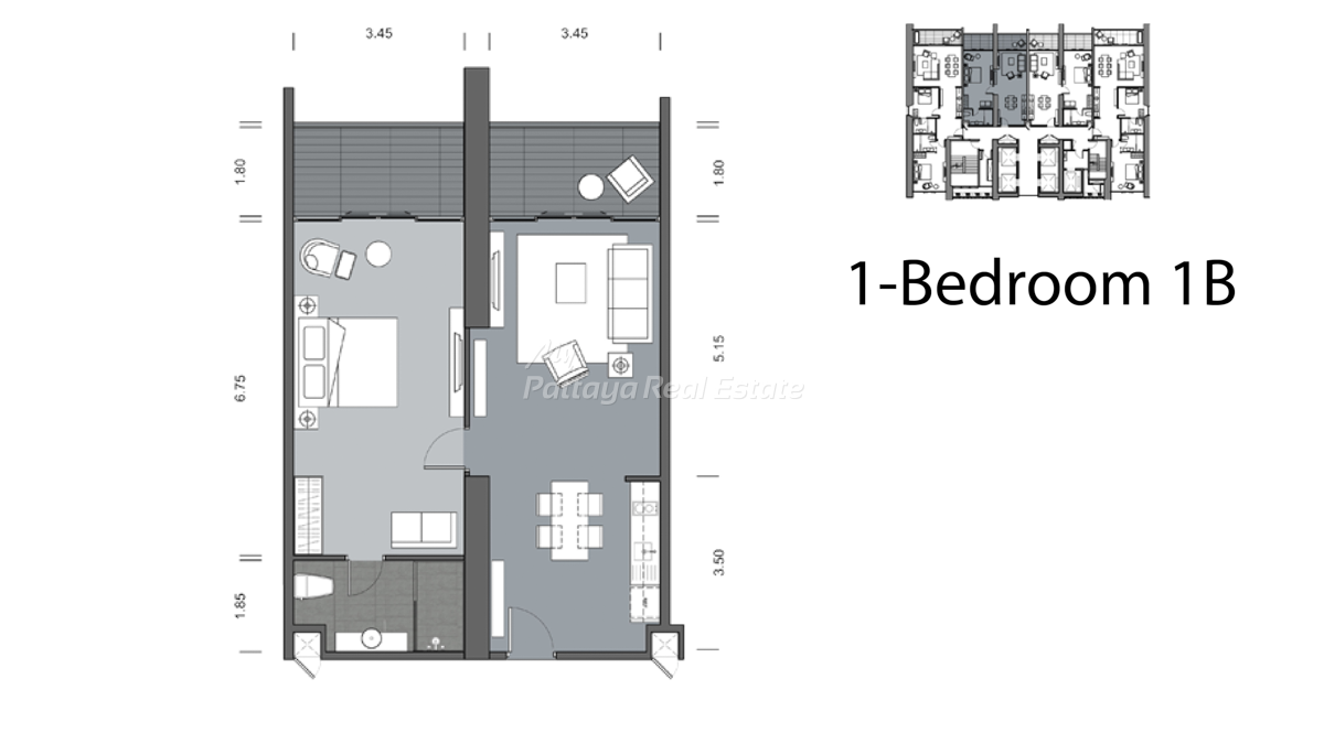 Zire WongAmat Pattaya – Type 1B, 76 Sq.M, 1 Bedroom / 1 Bathroom Unit Plan.