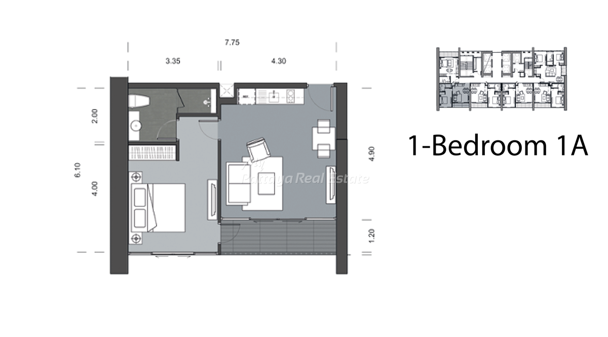 Zire WongAmat Pattaya – Type 1A, 49 Sq.M, 1 Bedroom / 1 Bathroom Unit Plan.