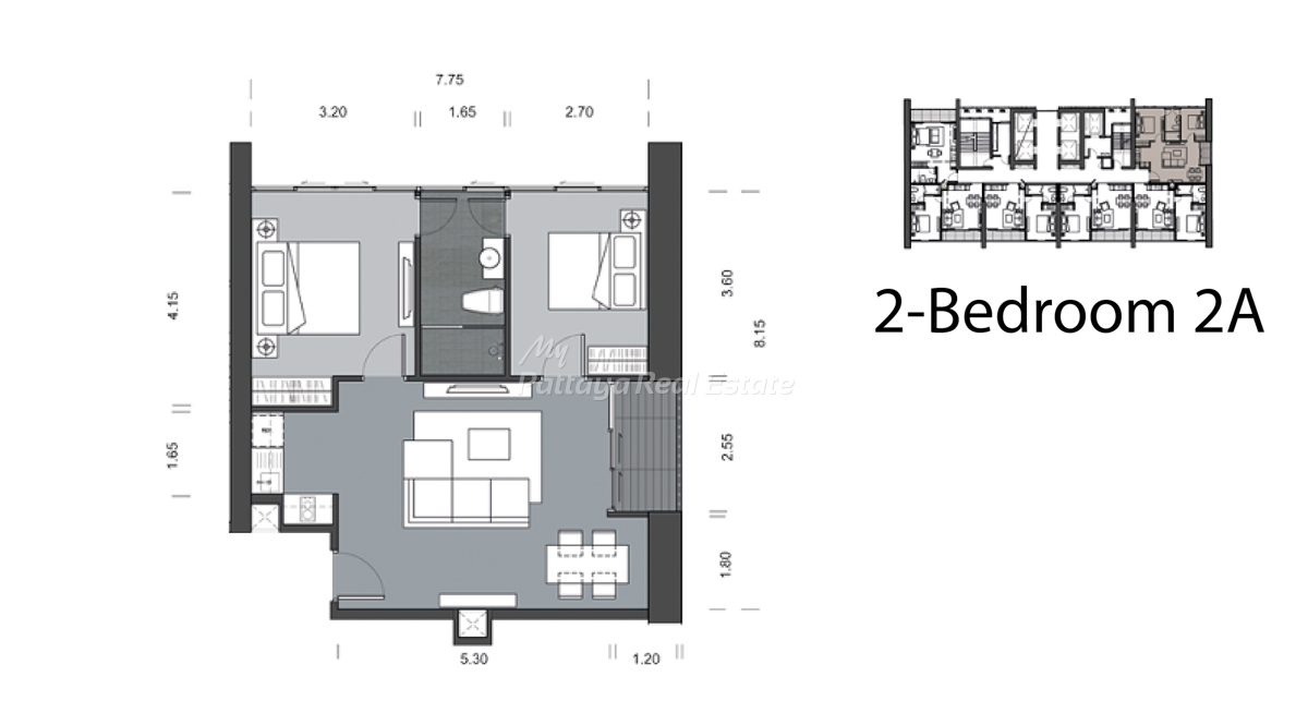 Zire WongAmat Pattaya – Type 2A, 62 Sq.M, 2 Bedroom / 1 Bathroom Unit Plan.