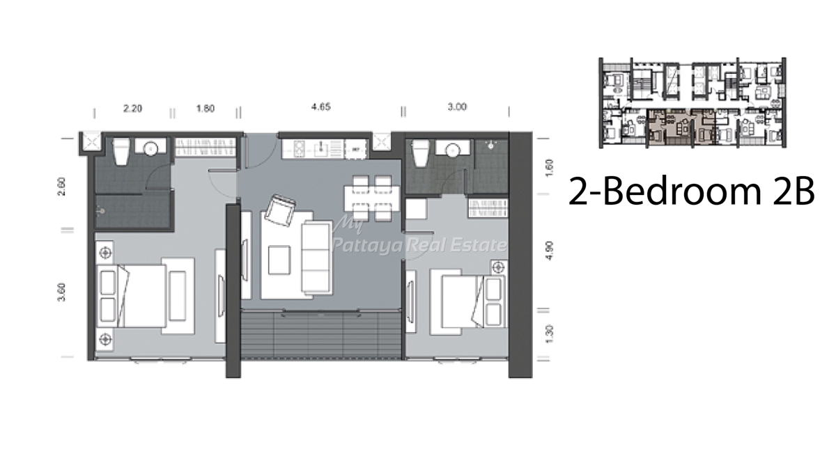 Zire WongAmat Pattaya – Type 2B, 88 Sq.M, 2 Bedroom / 2 Bathroom Unit Plan.